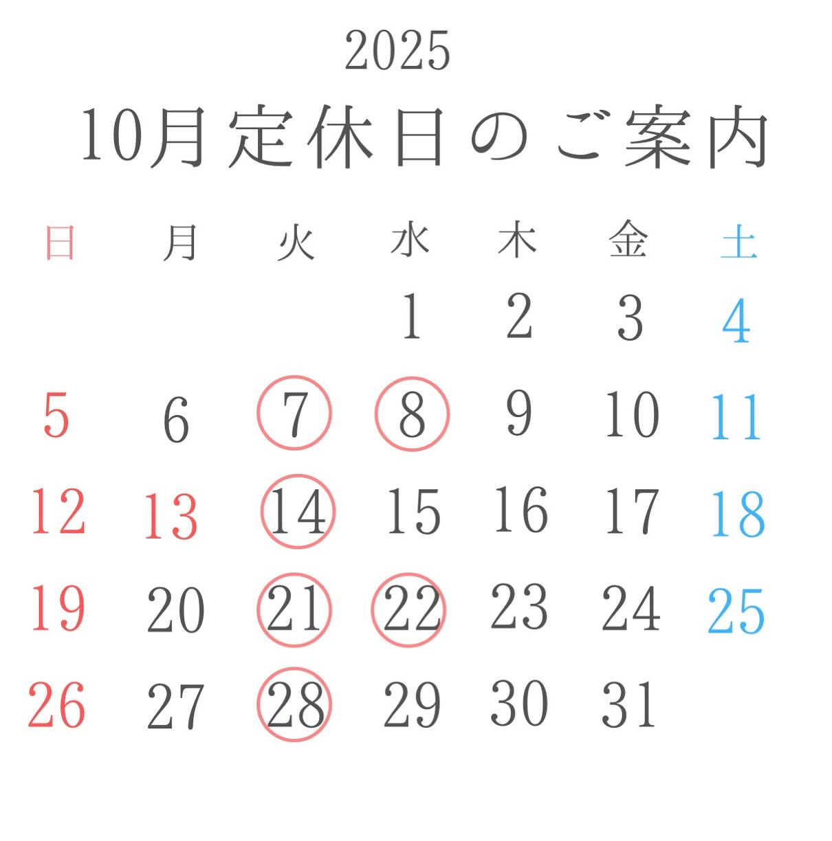 . 【お知らせ】 10月23日(木)は臨時の休業日とさせていただきます。 ご不便をおかけしますが何卒ご了承くださいますようお願い申し上げます。 11月の定休日……火曜日・10月第1,3水曜(10月8日、22日。今月は第1火曜日が2週目のため第2,4水曜日となります) 受付時間…AM10:00〜PM20:00 パーマー・カラーの受付時間は18時までです。 ご予約はお電話にて承ります。 心よりご来店をお待ちしております。
