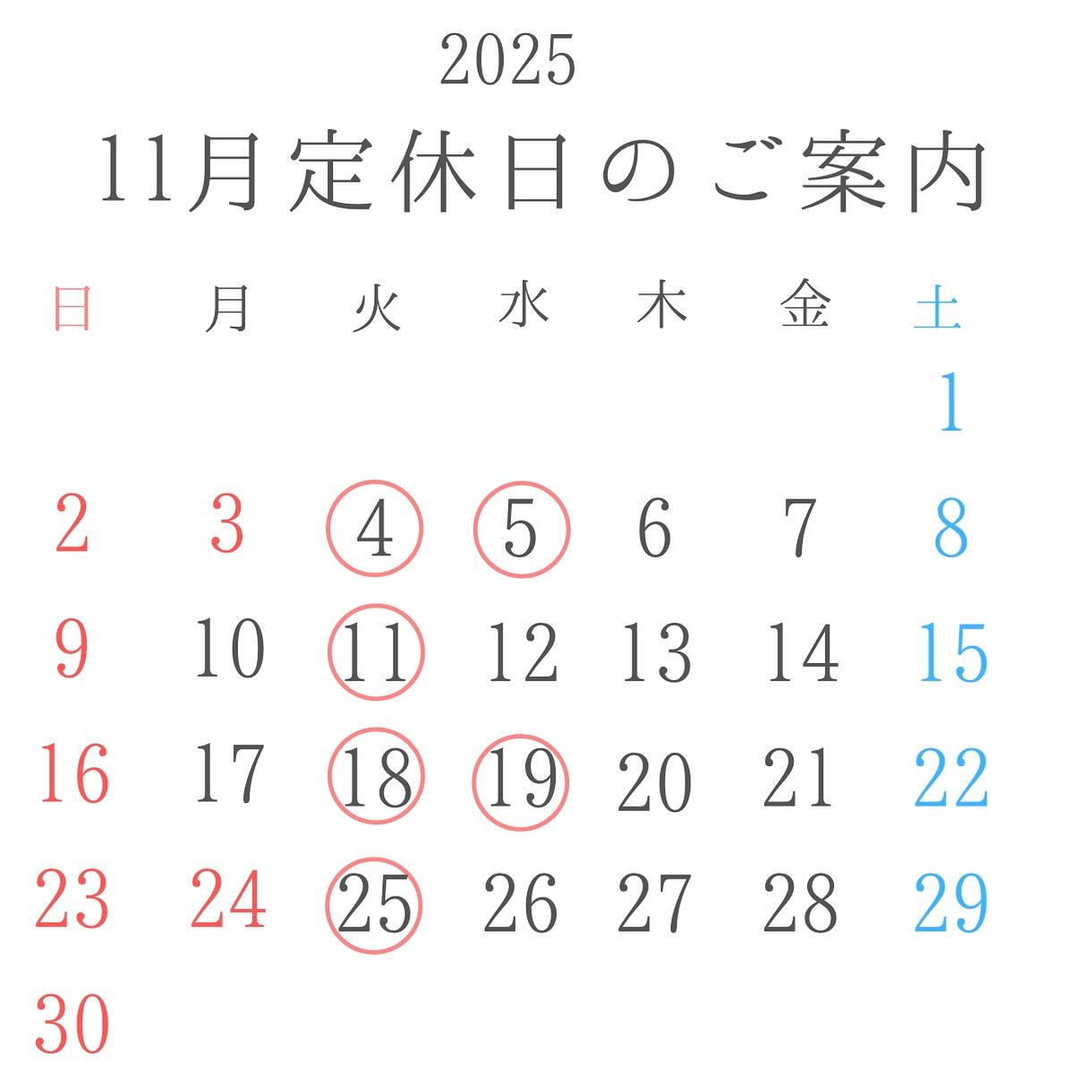 . 11月は通常営業です。 定休日……火曜日・第1、3水曜日(11月5日、19日) 受付時間…AM10:00〜PM20:00 パーマー・カラーの最終受付時間は18時。カットは19時です。 ご予約はお電話にて承ります。 心よりご来店をお待ちしております。